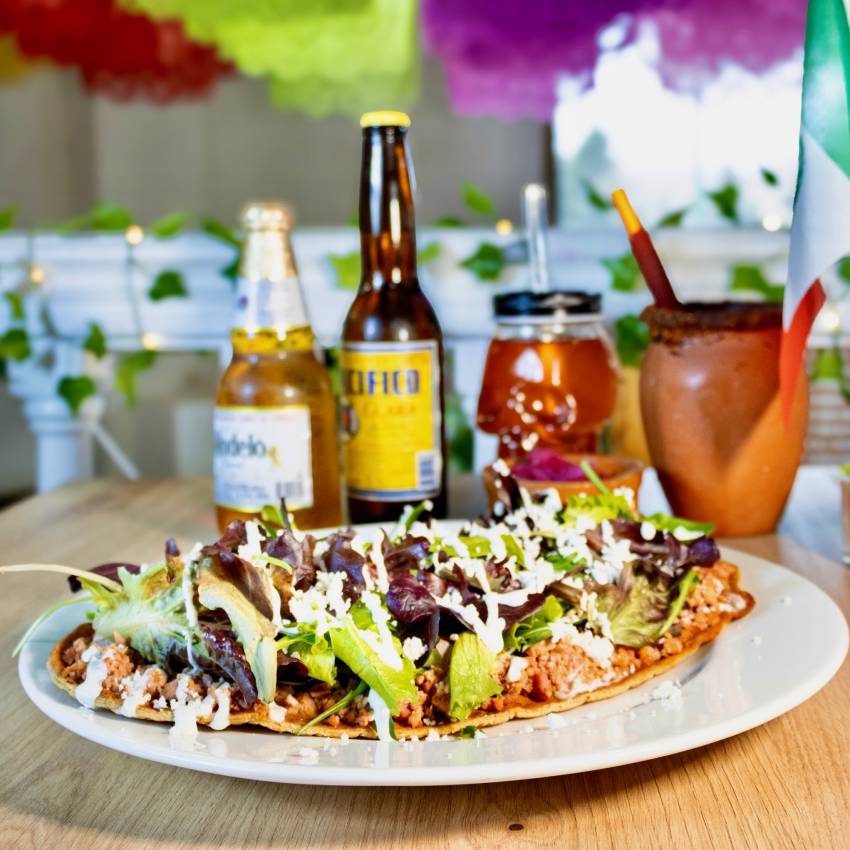 Elaborado artesanalmente con masa de maíz blanco nixtmalizado, con una cama de frijoles puercos, mezcla de lechugas mixtas, crema y queso para desmoronar mexicano.